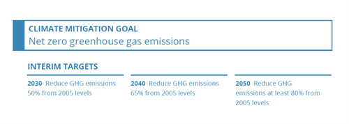To reach the goals, the climate plan lays out eight objectives for mitigating, or lessening the impacts of climate events. Decarbonizing energy sources, decarbonizing transportation, and reducing building energy usage are three of the factors that will make the greatest difference. The plan sets a climate mitigation goal of net zero greenhouse gas (GHG) emissions with a target of 80% reduction by 2050 and identifies the key sectors in which change will be required to meet that goal and interim targets.