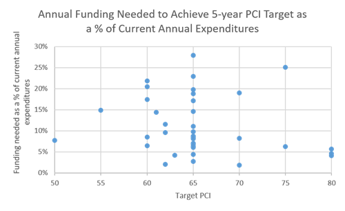 A total of $6.2 million in local funds were spent on expansion projects for roadways under local jurisdiction. Another $6.6 million in federal surface transportation program (STP) funding was used. To put those numbers in perspective, 30 of the 44 participating municipalities need less than the combined $12.8 million to close the five-year funding gap needed to reach their target PCI. As an example, one municipality spent $3.15 million in local funds on a single road expansion project despite needing to spend an extra $4.68 million over 5 years to hit their PCI target of 65 (fair condition).