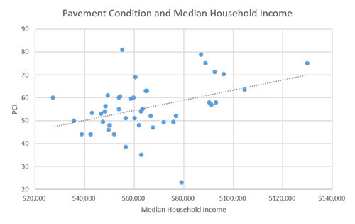 The municipalities that participated in the program varied widely in terms of population and density, from tiny exurban Burlington with just 681 people (2019 5-year ACS data), to Chicago-adjacent Cicero with over 82,000 people. We initially hypothesized that denser or larger places may be better equipped to provide higher-quality or more cost-effective services, and that may translate to better road quality. But the data don’t support that. So what does influence a local government’s ability to effectively maintain their local roads? Surprise, surprise: it’s all about the money. There is a much more apparent relationship between median household income and pavement condition. This suggests that higher-income
