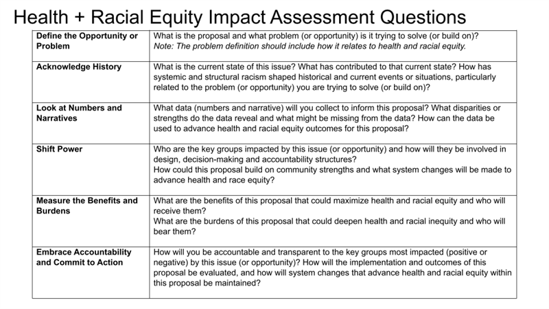 - Providing the Health and Racial Equity Impact Assessment questions (above) and training the Research Team facilitators on how to use the core questions to consider health and racial equity while creating guiding questions and objectives.