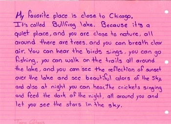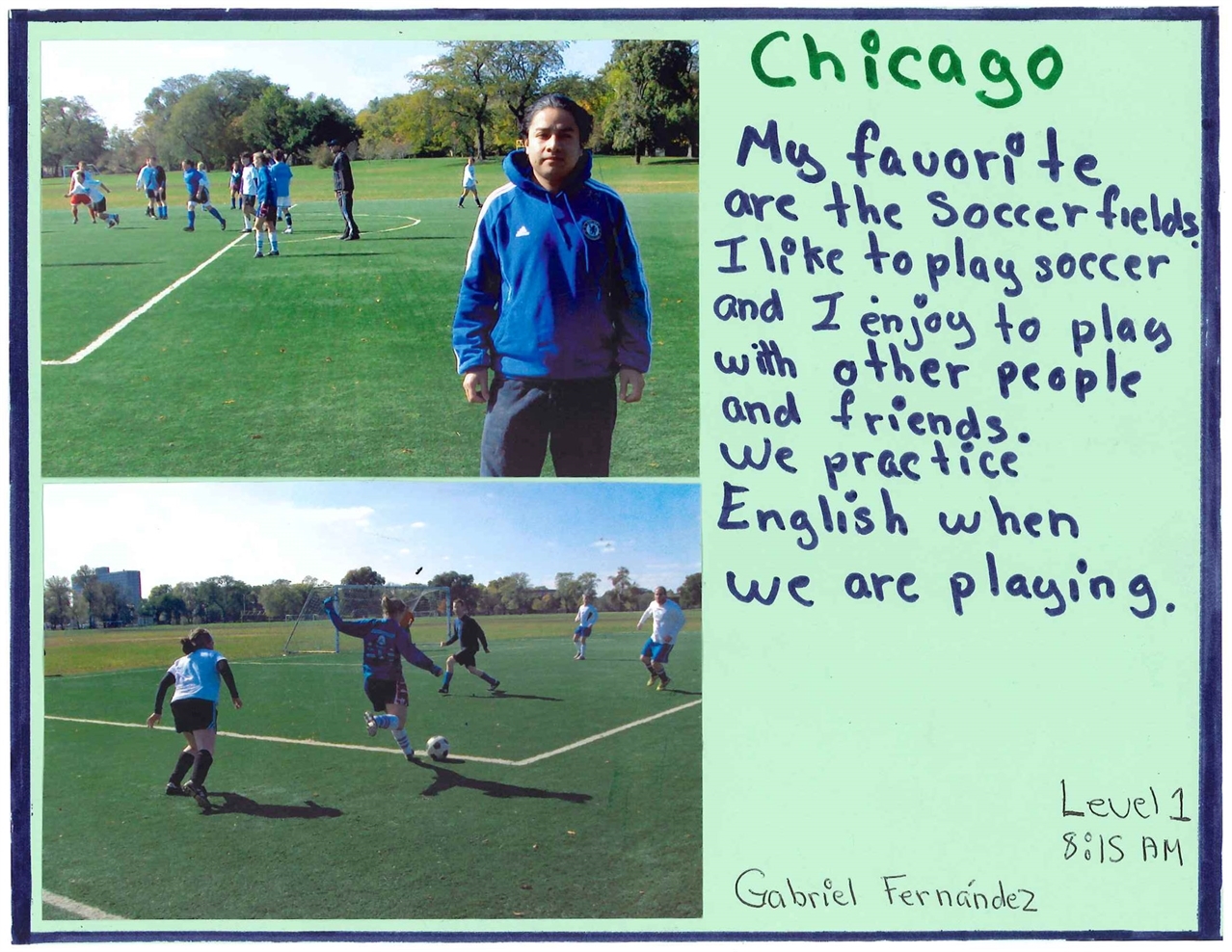 Public spaces, in contrast, can often provide a less rigid and more familiar opportunity to experience one's new home. Inspired in part by the "What Makes Your Place Great?" contest, students of English as a Second Language at Poder Learning Center in Pilsen wrote about their favorite public spaces in the region. Here’s a sampling of the essays, in their own words, colors and photos. The vast majority of Poder's students hail from Mexico, and live primarily in the Pilsen and Little Village neighborhoods of Chicago. The essays, written by adult students with a range of English ability (and one who is building Spanish literacy as a precursor to English), offer a glimpse into the processes of discovery, experience, and, ultimately, embracing particular places as an integral part of one's life.