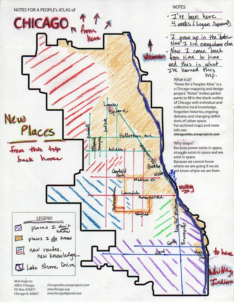 Now, imagine if you could visualize how other people experience Chicago. Pretty cool, right? AREA Chicago, a group dedicated to using cultural and educational practices as a means for social justice, thought so, and for the past five years they’ve been collecting hand-drawn maps through their “People’s Atlas of Chicago” project.