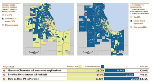 The Center for Neighborhood Technology (CNT), a Chicago-based nonprofit that provides urban sustainability solutions, created the Housing and Transportation (H+T®) Affordability Index to reveal what it costs to get around in neighborhoods across the country. The Index shows that transportation costs vary between and within regions depending on neighborhood characteristics. People who live in location-efficient neighborhoods—compact, mixed-use areas with convenient access to jobs, services, transit, and amenities—tend to have lower transportation costs. People who live in location inefficient places that require automobiles for most trips are more likely to have high transportation costs.