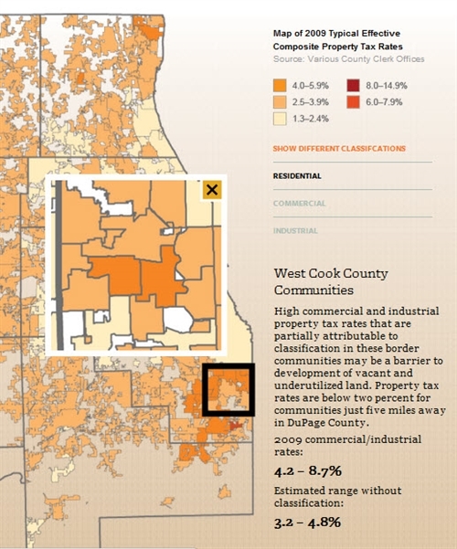 - Cook County Property Tax Classification drills deeper into the issue with case studies to show where phasing out Cook County’s classification system over time could help attract businesses to neighborhoods sorely in need of economic development. By exploring a clickable map and related data, the user can compare how residential, commercial, and industrial property tax rates vary across West Cook and South Cook communities.