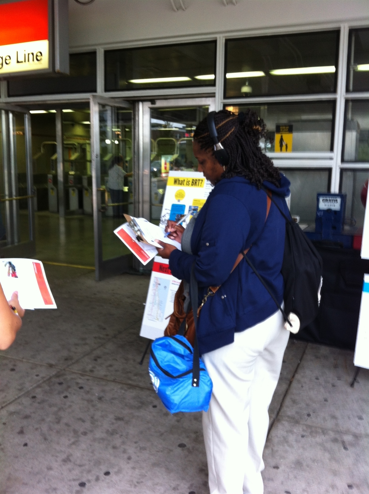 We fielded plenty of good questions about the proposed project, and provided riders with take-home information on BRT to share with their neighbors and friends. Some 130 people also signed a Riders for Better Transit petition asking local aldermen to prioritize bus-only lanes, a key feature of successful BRT.