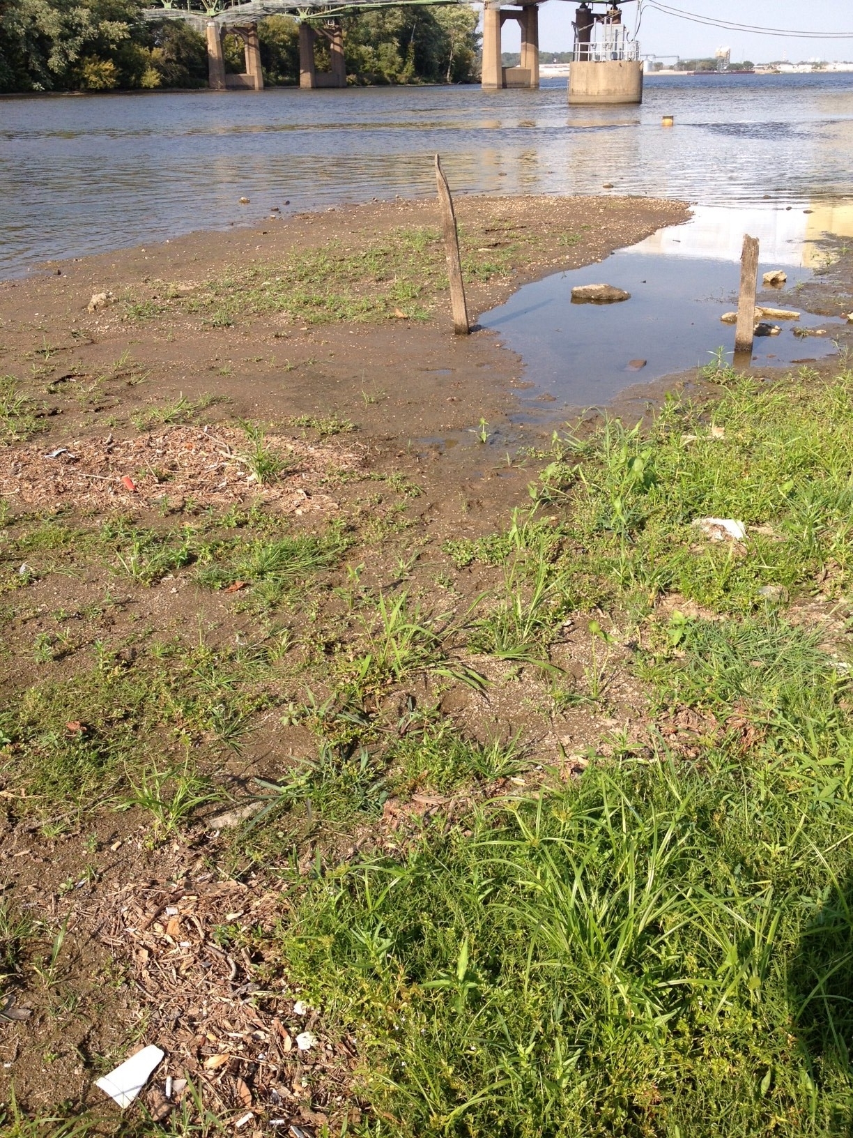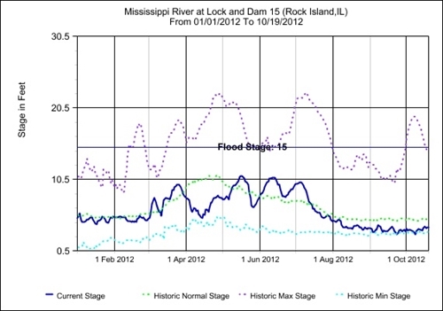 2012 Mississippi River level at Lock & Dam #15 compared to historic min, max and average levels.