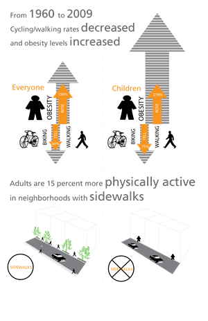 This isn’t just about personal decisions, because our options often are determined by others. Planners and city leaders in particular have a lot to do with how people live their lives. Growing up in my hometown of Kalamazoo, Mich., I lived about a quarter-mile from my high school. Rather than walk to school, however, my sisters and I begged our dad to drop us off. My parents – who grew up in then-dense Detroit and walked everywhere – were mystified. The reason was simple: there was no sidewalk on the route to school, and being seen walking in the ditch next to the road would have been totally uncool. What a missed opportunity to establish a very different culture among young people. So, sidewalks: pretty basic. A report from Active Living Research notes that the percentage of adults who are sufficiently physical activity is 15 percent higher in neighborhoods with sidewalks than in those without.