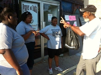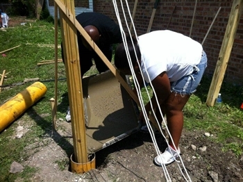 The young women attracted many spectators as they cleaned up the site. The local community was curious about what the team was doing, as the area has been better-known for people hanging out rather than taking care of it. That went for the larger lot across the street, too. But as the girls worked to clean up their lot, the people across the street, “those who haven’t discovered their purpose yet,” as T-awannda Piper of D2F put it, began to clean up their lot, too. “All of the sudden, the people across the street were out there with brooms, dust pans and garbage bags cleaning up their space.” Passersby found it fascinating to watch the young women working with power tools to recreate their space. As construction began, onlookers were eager to help – and they had skills to offer, too. Local community members helped cut wood, mix concrete, and continued cleaning up the site. The support was overwhelming. “Lots of people would walk by just to let us know they’d be coming back later to help.” T-awannda recalls, “It was like an open workshop for the community.”