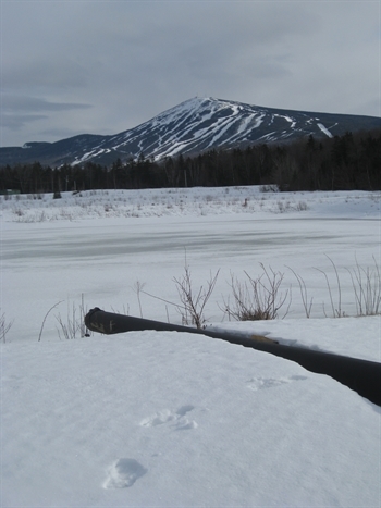 The plant discharges to several holding lagoons, seen here somewhat frozen over. Sugarloaf looms in the background.
