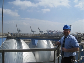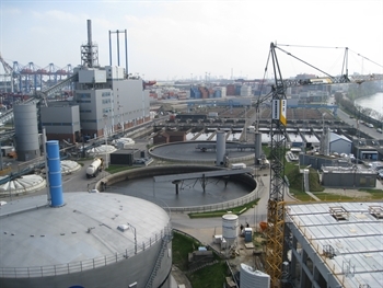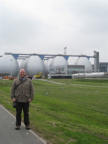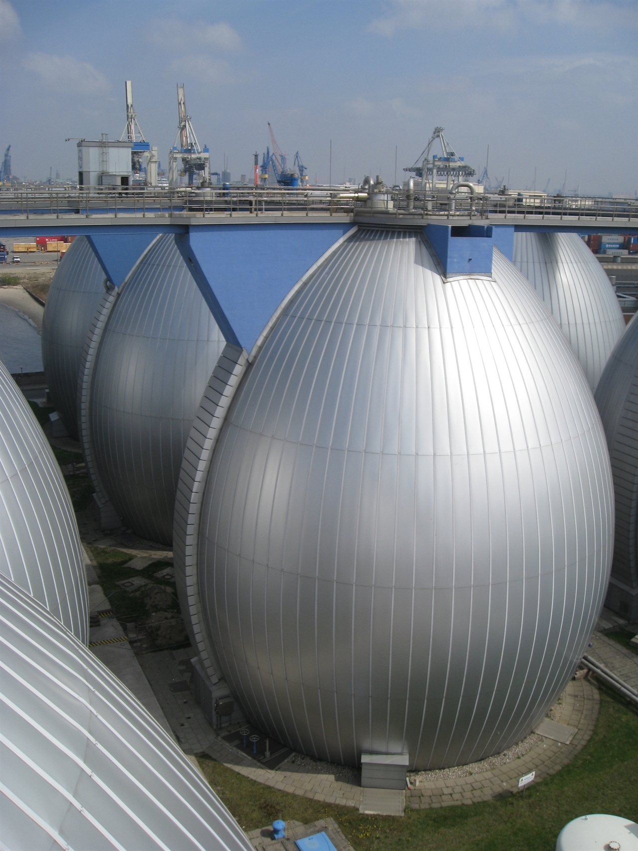 Hamburg Wasser's main wastewater treatment plant is net energy positive - it produces more than it takes to run the place. The giant eggs in the background are anaerobic digestors, breaking down sewage waste into methane and residual organic material that is later burned.