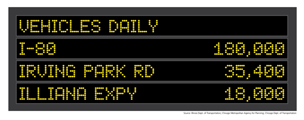 - Low usage: Because the road would run through a lightly populated area and would be tolled, IDOT estimates that the road would see only 8,800 to 26,300 vehicles per day—fewer than many arterial roads such as Irving Park Road in Chicago at 35,400 vehicles per day or Cermak Road in Cicero at 33,900 per day, and far fewer than major highways like I-80, which carries upwards of 180,000 vehicles per day.