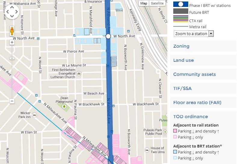 The interactive map, provided for free use by community members, developers and others interested in the future of Ashland Avenue and Chicago as a whole, offers detailed information about the corridor along which Chicago’s first gold-standard BRT line will run. Ashland Avenue BRT, scheduled to open in 2015, will increase bus speeds by up to 80 percent between 31st and Cortland Streets by giving buses dedicated lanes, off-board ticketing, improved stations and priority at signals.