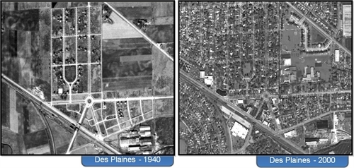 The photos above show the changes in land use in Des Plaines over 60 years. Now, more than 40 percent of the land is impervious surface. Time to start peeling back some of the concrete skin we’ve laid over the landscape!