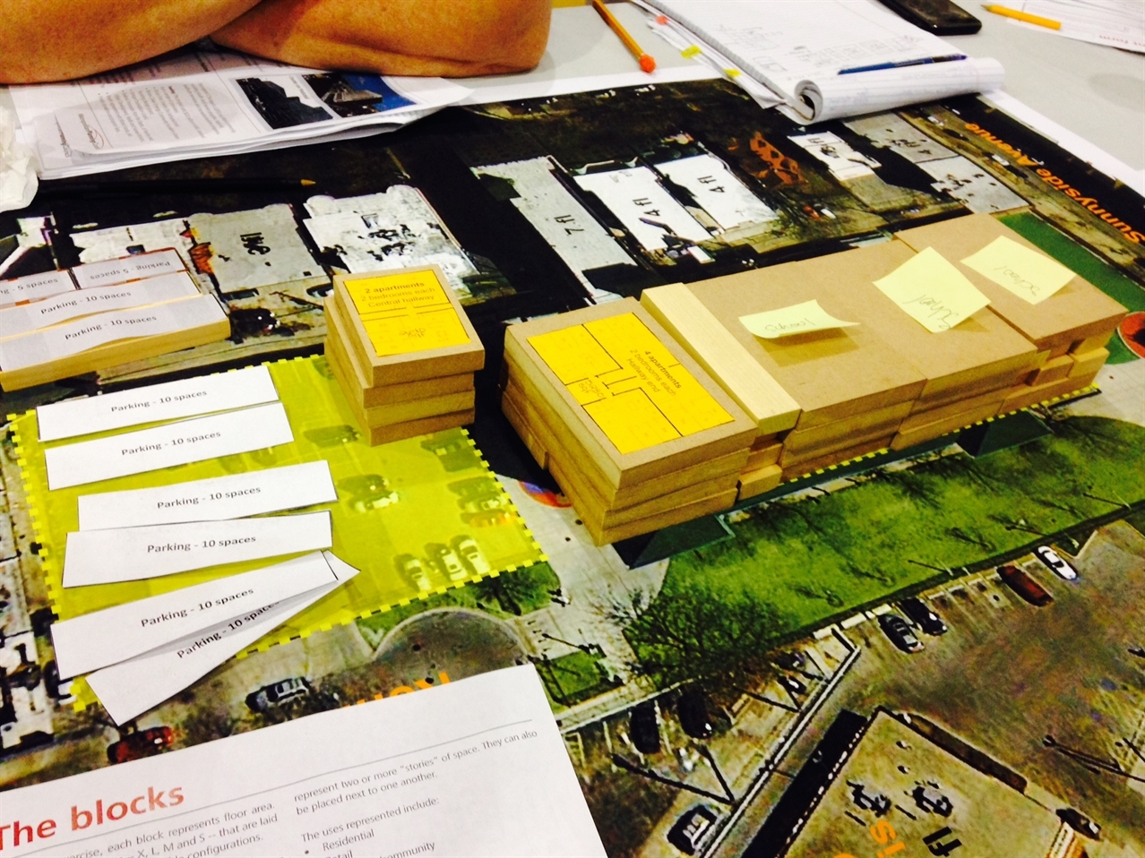 Yesterday’s meeting focused on a block exercise where participants “build” their ideas with blocks on aerial maps. Working with their tablemates, participants were able to propose ideas for the former Stewart School and the vacant land that will be available next to the Wilson CTA Station. Once the participants proposed a development plan, they worked with developers and architects to assess its financial feasibility and work on design details for their proposal.