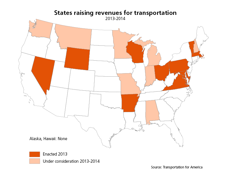 More and more, voters are opting for investment: According to the Center for Transportation Excellence, 73 percent of intra-metropolitan transportation measures passed in 2013, as did 79 percent in 2012. While state-level ballot measures on infrastructure investments are far less common, in 2013 eight states voted to raise fuel taxes. This includes both conservative states like Wyoming and Democratic-controlled legislatures like Maryland’s. Illinois is not on that list—its tax has remained at 19 cents per gallon since 1990.