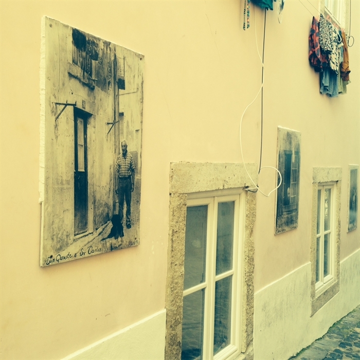 For Joao and his colleagues, though, the challenge was not simply how to revitalize the area; it was how to do so in a way that involved and retained its longtime residents. We learned of several initiatives to that end, such as performers who met with elderly residents, learned their life stories and then performed them, both in public and in their living rooms. Another effort became evident just by wandering up and down the neighborhood's hilly alleys: photos of actual longtime residents themselves, captured going about their daily lives—leaning out of windows, walking home with groceries, playing dominoes with friends—and placed on buildings where they actually live. Here is a sampling: