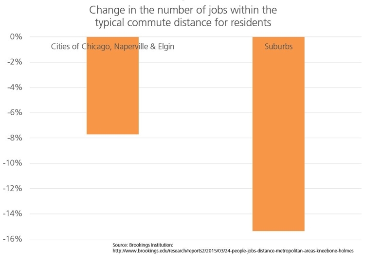 In metropolitan Chicago, between 2000 and 2012 the number of jobs within the typical commute distance, which Brookings defines as 10 miles in Chicago, fell by 14 percent. Of the 96 metros studied, the Chicago metro ranks 85th in the growth in number of jobs near the typical resident, tied with Birmingham, Alabama, and Akron, Ohio.