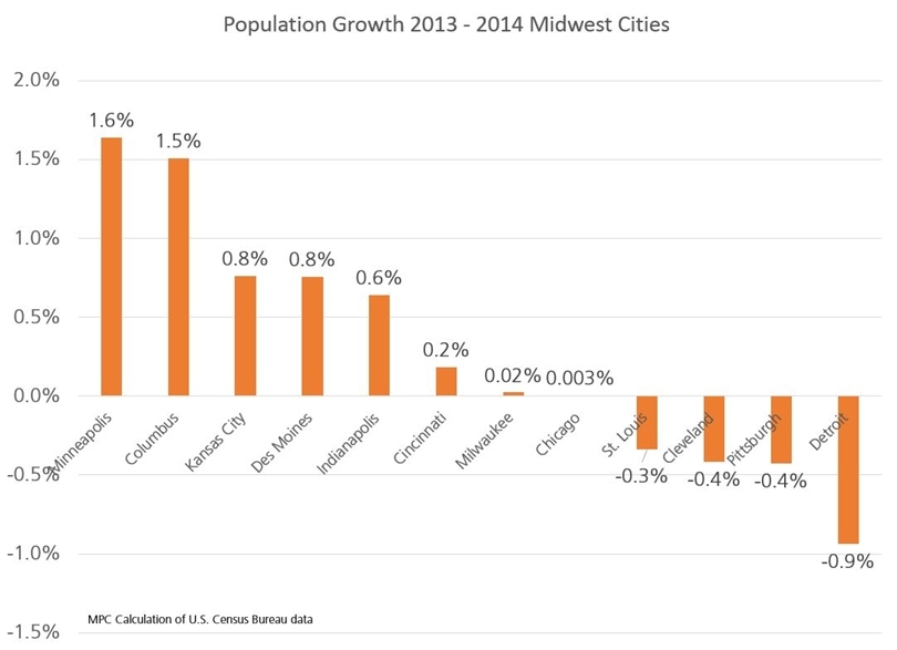 Is slow growth a Midwest phenomenon? It depends on how you look at it. St. Louis, Cleveland, Pittsburgh and Detroit—all former industrial Midwest cities—saw their populations decline last year. But plenty of other Midwestern cities grew at faster rates than Chicago.