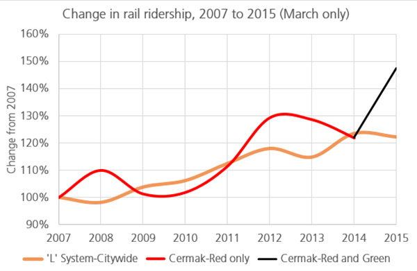 Yet, while ridership on those lines actually fell more than the CTA bus average between 2013 and 2014, they increased between 2014 and 2015 (March only), even as CTA bus ridership continued to fall. So the addition of the new station not only seems to have contributed to increased overall rail boardings in the Cermak Red and Green Line area, but it also does not appear to have reduced bus route use in the surrounding area.