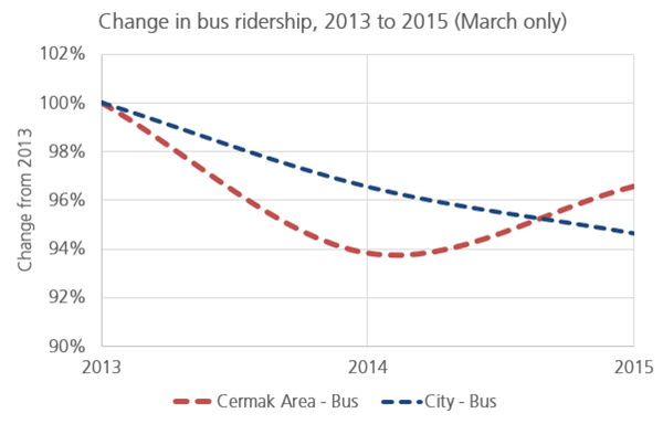 Nor does it appear that the opening of the new station has moved people away from nearby bus routes, as the following chart shows. Several bus routes that stop near the Cermak-McCormick Place station, including the 1, 3 and 4 buses, run roughly similar routes to the Green Line as they run north-south into downtown. So a new train station could have theoretically moved people away from those lines and onto the ‘L.’