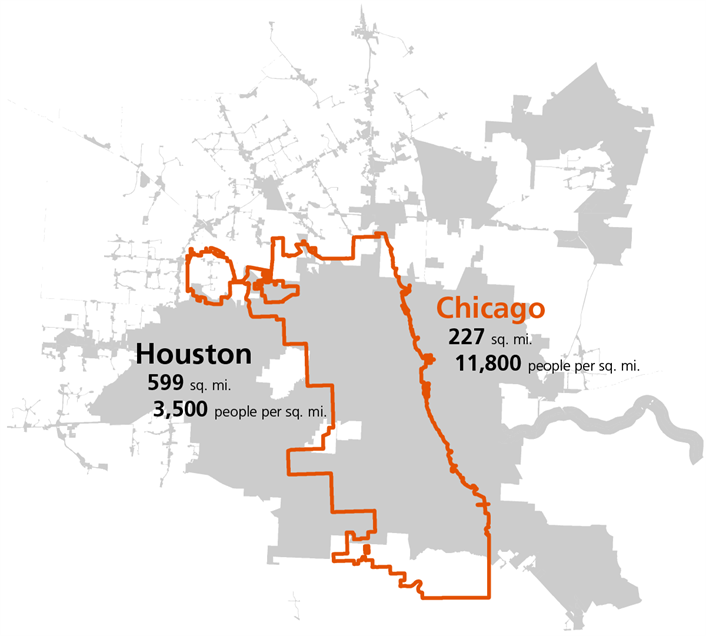 That all looks pretty rosy for Houston, but here’s the issue: Houston’s growth comes at a cost: mainly sprawl, poor air quality and traffic congestion. In fact, Houston may be the very definition of sprawl. According to the U.S. Census, at 599 square miles the city is more than double the area of Chicago’s 227 square miles. Houston's population density is much lower, with only 3,500 people in each square mile compared to 11,800 in Chicago. The City of Houston is larger than the combined area of Philadelphia, Detroit, Baltimore and Chicago. In total, those four cities have a population of 5.5 million people, or 3 million more than Houston, living in the same amount of space.
