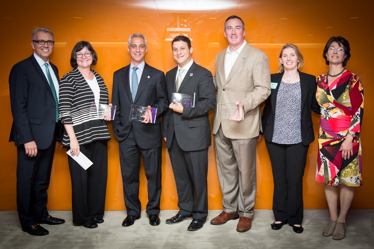 George Sorich, a principal at NORR, presented the awards to the winners: Beth White of The Trust for Public Land, Chicago Mayor Rahm Emanuel, Mike Kelly and Bryan Traubert of the Chicago Park District and Ben Helphand of Friends of the Bloomingdale Trail.