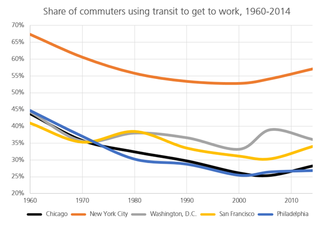 New York has led the movement back to transit, with the share of commuters using transit in 2014 (57 percent) the highest level in that city since the 1970s.