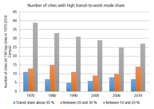 Nationwide, the number of major cities with at least 10 percent of commuters using transit increased from 2006 to 2014, but remains significantly below 1970. Forty-eight cities had that rate of commuting in 2014, versus 63 in 1970.