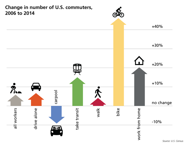 As a whole, the nation moved slightly away from driving between 2006 and 2014, with a big drop in the share of people carpooling to work (the number of people driving alone to work increased by 6 percent). Meanwhile, transit use increased by 14 percent and accounted for 5.2 percent of commutes in 2014. The number of people commuting to work on a bike increased by 45 percent.
