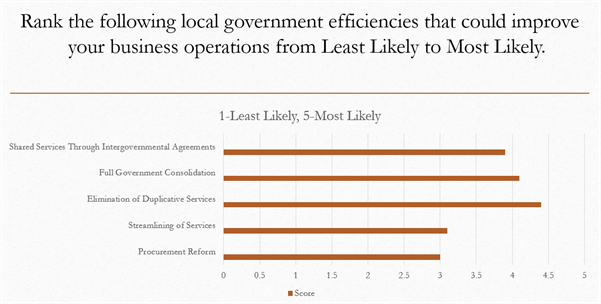 We asked our members to rank different efficiency strategies from “least likely” to “most likely” to improve business operations. They told us that eliminating duplicative services is the most likely way municipalities can help to improve business operations. This was followed very closely by full government consolidation and shared services through intergovernmental agreements.