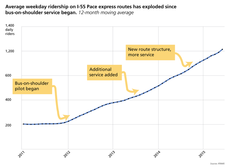 Pace’s service on I-55 is performing so well that the Illinois General Assembly approved a bill last year making the original bus-on-shoulder pilot project permanent, and extended the program to make it legal on all Chicago-region expressways and tollways.