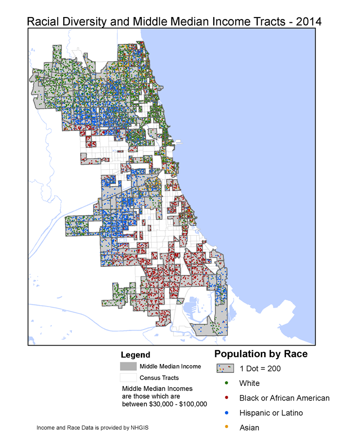 The African American and Latino middle class census tracts are largely homogenous, while whites in middle class tracts enjoy a more diverse experience. With the exception of pockets on the Southwest Side and Hyde Park, the white middle class is essentially a North Side experience.