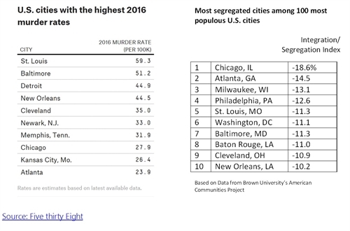 When you look at cities with the highest murder rates and highest segregation rankings there are striking similarities. Seven of the ten most segregated cities also have high murder rates. These cities also have common patterns of poverty and disinvestment concentrated in communities of color.