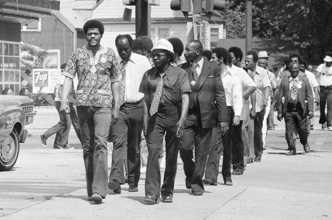 Demonstrators march through Chicago's Marquette Park neighborhood in 1976 to protest racial segregation in housing.