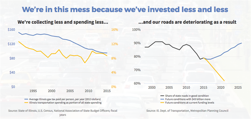 People expect a functioning, reliable multimodal transportation system. But the reality is that we are just not spending enough to get that. The potholes, slow zones and bus breakdowns are not something we have to accept. To get Illinois to an acceptable standard we need to spend more money on transportation. The state gas tax has not been raised since 1991, and the purchasing power of this revenue has decreased by more than 40 percent.