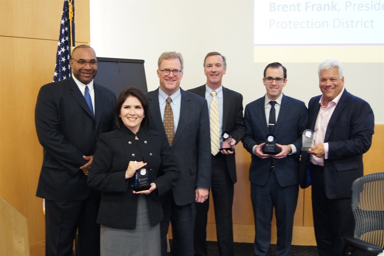 The 2017 Illinois Transformer Awards honored local leaders committed to government efficiency reform. Pictured left to right: Gordon Smith, Lt. Governor Evelyn Sanguinetti, Chairman Dan Cronin, Brent Frank, Matt Brolley, and Chairman Jack Franks