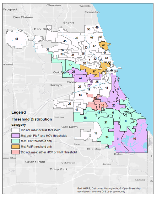 In order to understand how wards that meet the “over 10 percent” threshold manage to do so, we also dove into distribution of affordability by unit type. On the map on the right, we display a breakdown of wards, distinguishing between those that meet the overall 10 percent affordability threshold in color versus those that do not in white. Further, we break out wards according to whether or not they meet the 10 percent threshold by ward when only counting permanent multifamily units or HCV units.
