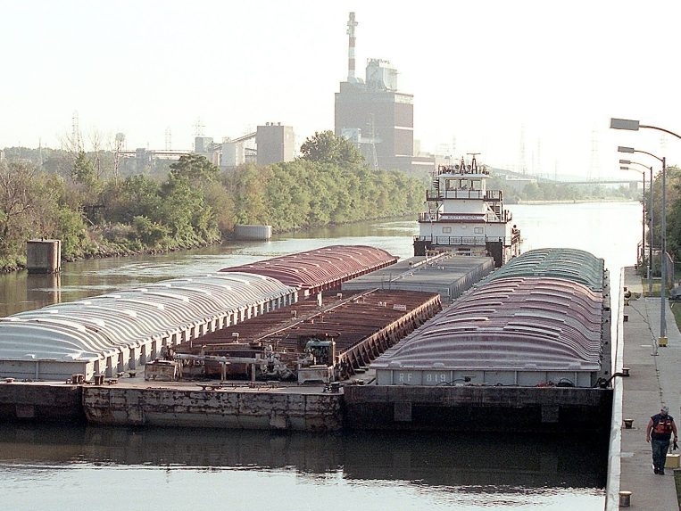 A tow boat waits to pass upriver through the Brandon Road Locks after cutting its string of barges so the first half could fit into the lock.