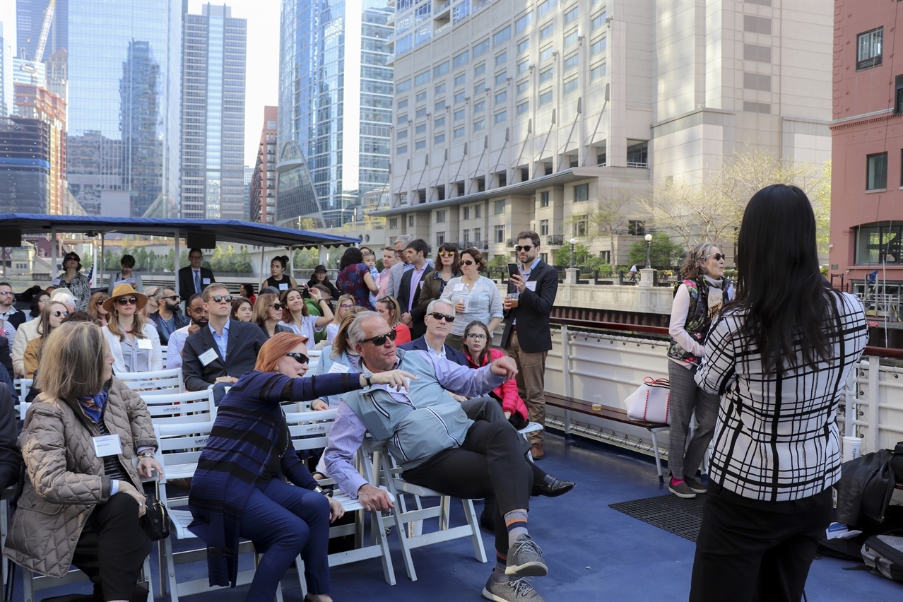 On May 15, MPC, along with our partners and supporters, set sail along the North Branch of the Chicago River. It was an opportunity to enjoy each other’s company and hear about all the exciting developments and activities that have been occurring along the waterway. It was the first time in several years that MPC had conducted a tour of the North Branch, so there was a lot to catch up on. Attendees heard from a range speakers that discussed the impact of the revised Chicago River Design Guidelines on future development, design and community engagement to transform part of the river into the Wild Mile (a new park inside the river that includes floating gardens and boardwalks), improvements to the Riverwalk, and new developments like the Salt District and Lincoln Yards that will have a significant impact on accessibility along the riverfront. This event was also part of Chicago Community Trust’s On the Table conversations. Comments and conversations fueled by this tour became part of a Memo to Mayor to let the new administration know how they would like to continue to see the river engaged and activated.
