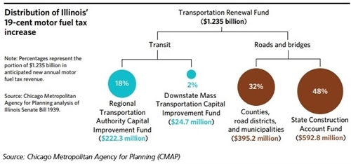 It is a major achievement that the Rebuild Illinois investments will be funded with sustainable annual sources of transportation funding—motor fuel tax and vehicle registration fees—compared to previous capital bills that relied on non-transportation sources that did not generate as much funding as anticipated. This revenue is protected by the “lockbox” constitutional amendment that passed in November of 2016 mandating that transportation revenues be used only for transportation.