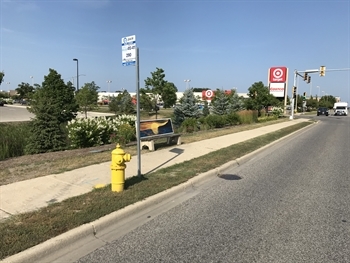 Crosswalks: Many times, your destination is actually on the other side of the street from where you get off the bus. We looked for marked crosswalks at all intersections near the bus stop. Most stops have crosswalks across small cross streets adjacent to the bus stop, but many are missing safe crossings across the large arterials common in the suburbs. A 5-lane road with no crosswalk and no pedestrian signal may as well be a brick wall.
