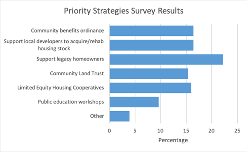 Next, MPC manager Juan Sebastian Arias dug into potential priority strategies identified through a mix of local lived experience, affordable housing research, and policy best practice. Through an informal poll, participants were asked to rank their top three priority strategies. Results showed that their number one priority is to support legacy homeowners stay in place, followed by supporting local developers to acquire and rehab housing stock, developing and passing a community benefits ordinance, and developing Limited Equity Housing Cooperatives as affordable ownership opportunities for low-income residents.