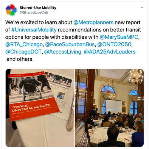 On December 3rd, after more than a year of research and interviews, MPC released a new report focused on building a better transportation system for people with disabilities in the Chicago region: Toward Universal Mobility: Charting a Path to Improve Transportation Accessibility. As part of the release MPC held a lively panel discussion on mobility for people with disabilities at the Union League Club, which was attended by 150 advocates, transportation providers, elected officials and experts. Risa Rifkind of ADA 25 Advancing Leadership, a member network of over 115 powerful local leaders with disabilities, moderated the panel. Adam Ballard of Access Living shared his perspective as a lifelong disability advocate and policy expert. Jackie Forbes of Kane County Division of Transportation spoke about her experience managing Kane County's coordinated Dial-a-Ride system. Judy Shanley of Easterseals and the National Center for Mobility Management provided a national perspective on policies and best practices in mobility management. Finally, MPC's Audrey Wennink tied the conversation back to the report's 32 recommendations.
