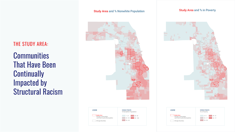 It became clear early on during the pandemic that COVID-19 was having devastating impacts on Black and Latinx populations across the Chicago region. By now, it should not be a mystery that these disparate impacts result from longstanding structural conditions. They were created and reinforced by public policies and patterns of investment and disinvestment, rather than by health choices or behaviors. It is the same diagnosis that we also find for many of our biggest challenges, whether it be neighborhood violence, mental health challenges, environmental justice, or some other future health crisis. Longstanding inequalities can be thought of as a tinderbox, and COVID-19 was just the latest match to ignite this tinderbox, with devastating results for BIPOC communities.