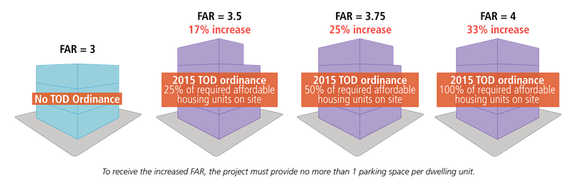 As noted above, to receive the full benefits of the TOD ordinance, which allow projects in B-3 or C-3 zones to receive FAR boosts up to 4, 100 percent of all required affordable units must be provided on site (equivalent to either 10 or 20 percent of total units, depending on whether the project receives City financing assistance or not). To receive partial benefits, such as an additional height increase or an increase of the FAR to 3.75, 50 percent of required affordable housing units must be provided on site (equivalent to either 5 or 10 percent of total units, depending on whether the project receives City financing assistance or not).