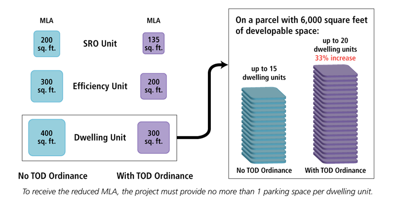 The ordinance passed in 2013 applied to a smaller zone of applicability, only affecting parcels within 600 feet of station entrances (or 1,200 feet along pedestrian streets). It allowed projects to increase their FARs and building heights, as well as reduce their MLAs, much as with the current ordinance, but the provisions were different. Notably, that ordinance did not include any specific additional benefits for projects with additional on-site affordable units.