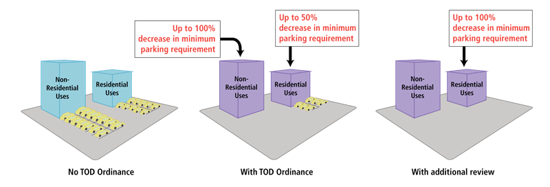 The 2013 ordinance also limited parking minimum reductions to 50 percent of the standard for residential units.